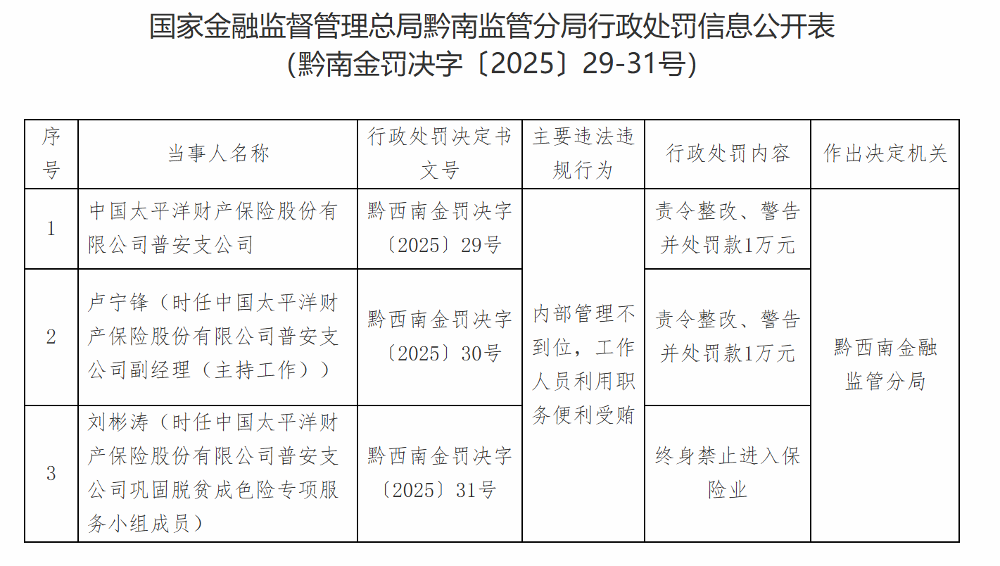 12月9日,国家金融监督管理总局黔南监管分局行政处罚信息公开表显示,中国太平洋财产保险股份有限公司普安支公司因内部管理不到位,工作人员利用职务便利受贿被责令整改、警告并处罚款1万元;卢某锋被被责令整改、警告并处罚款1万元;刘某涛被终身进入保险业。